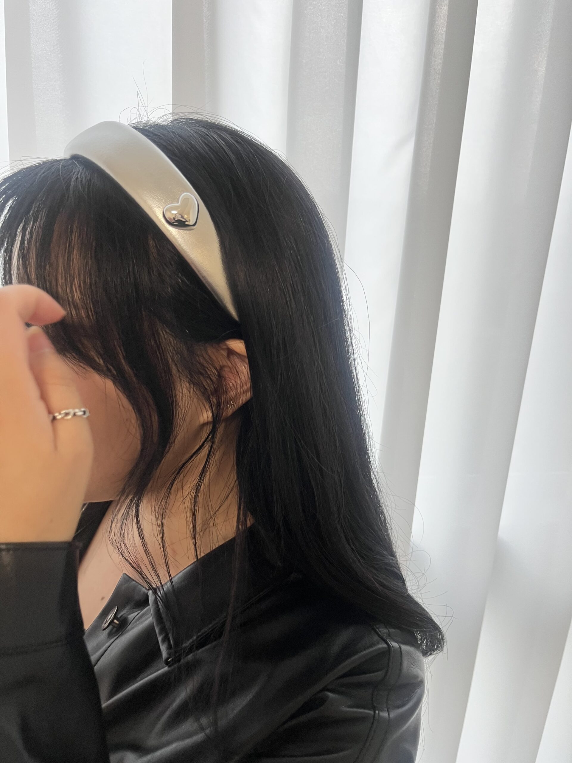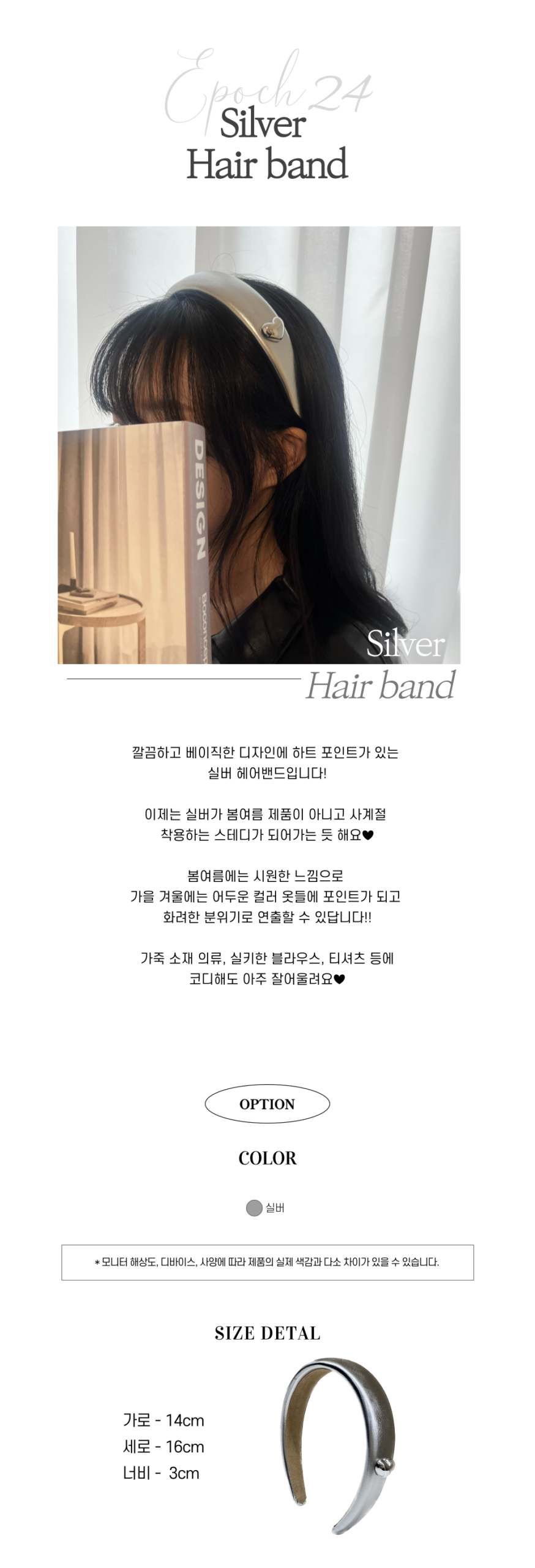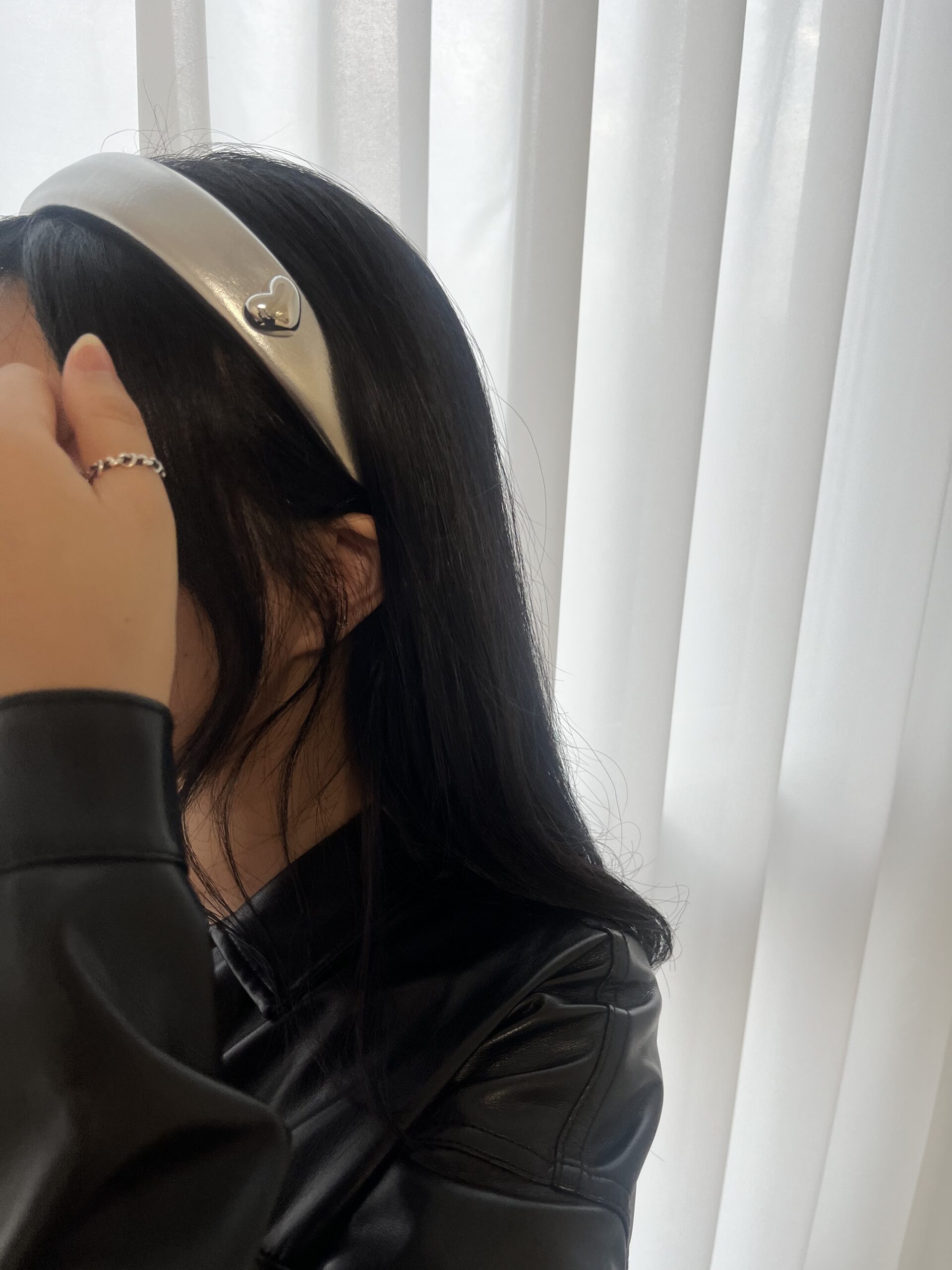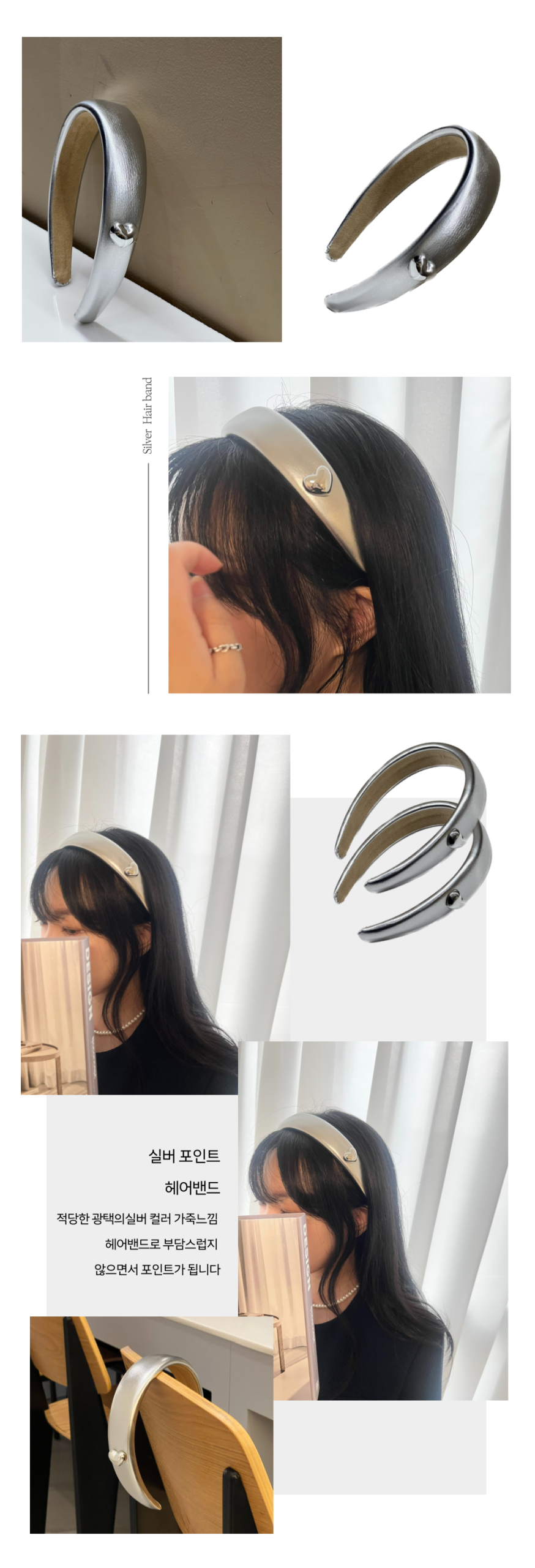 깔끔하고 베이직한 디자인에 하트가 포인트인 실버 헤어밴드입니다! 실버가 봄여름 제품이 아닌 사계절 착용하는 스테디가 되어가는 듯 해요:) 가을,겨울에도 어두운 컬러 옷에 포인트로 착용가능하고 연말에 화려한 분위기로 연출할 수 있는 제품입니다! 가죽 소재 의류, 실키한 블라우스, 티셔츠 등 다양하게 코디해도 잘어울려요