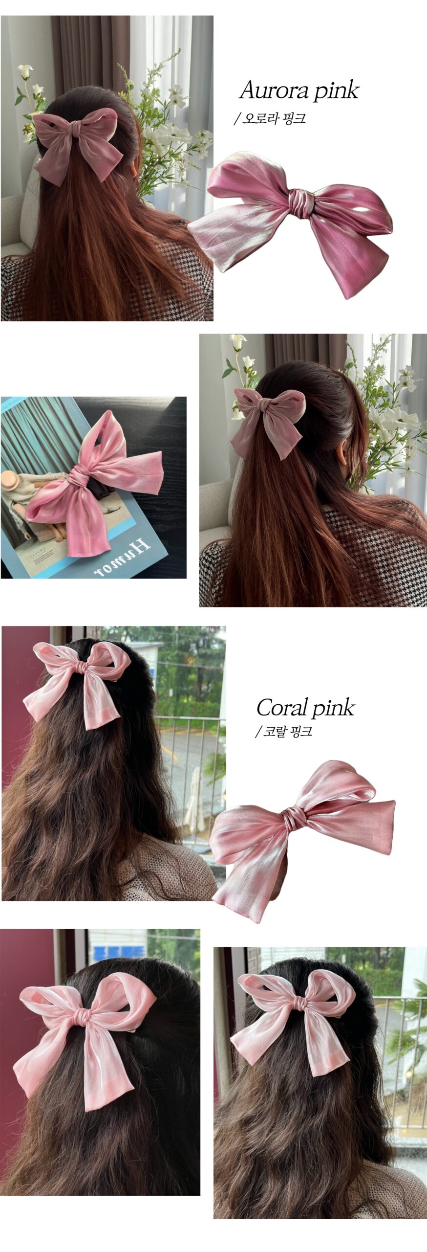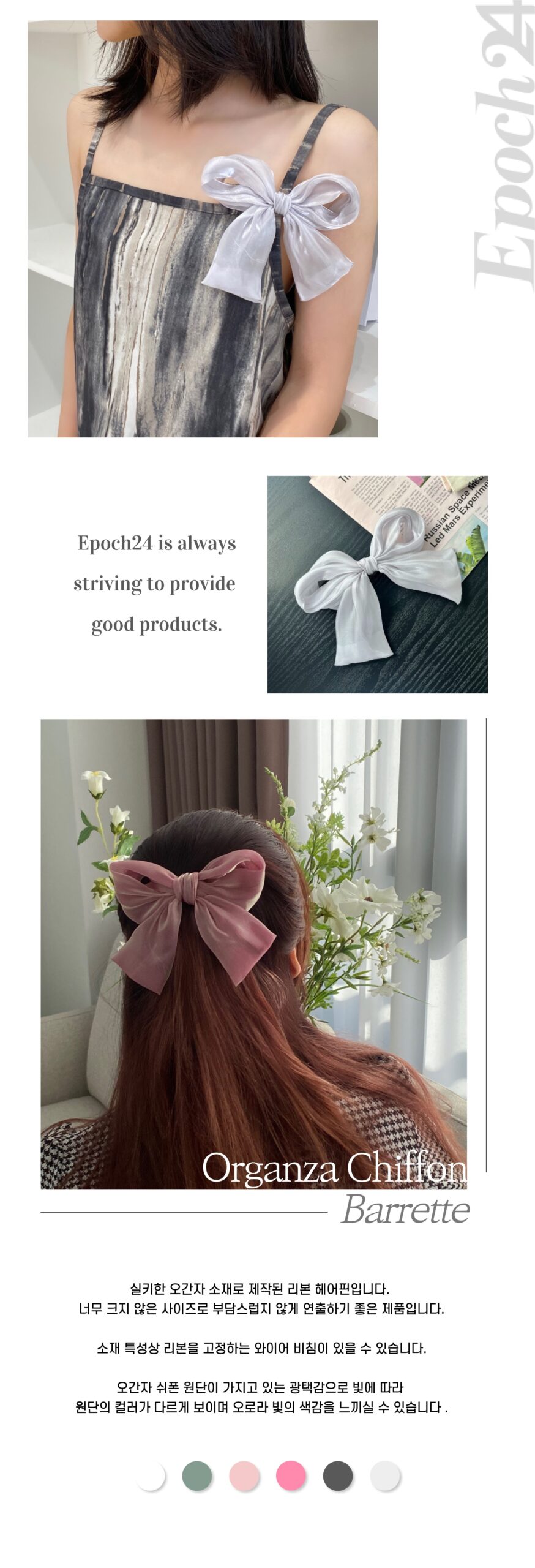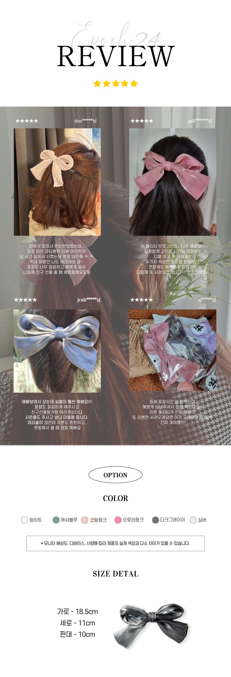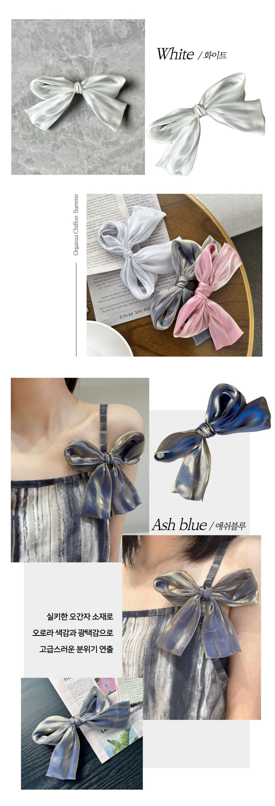 실키한 오간자 소재로 제작된 리본 헤어핀입니다. 너무 크지 않은 사이즈로 부담스럽지 않게 연출하기 좋은 제품입니다. 소재 특성상 리본을 고정하는 와이어 비침이 있을 수 있습니다. 오간자 쉬폰 원단이 가지고 있는 광택감으로 빛에 따라 원단의 컬러가 다르게 보이며 오로라 빛의 색감을 느끼실 수 있습니다 .