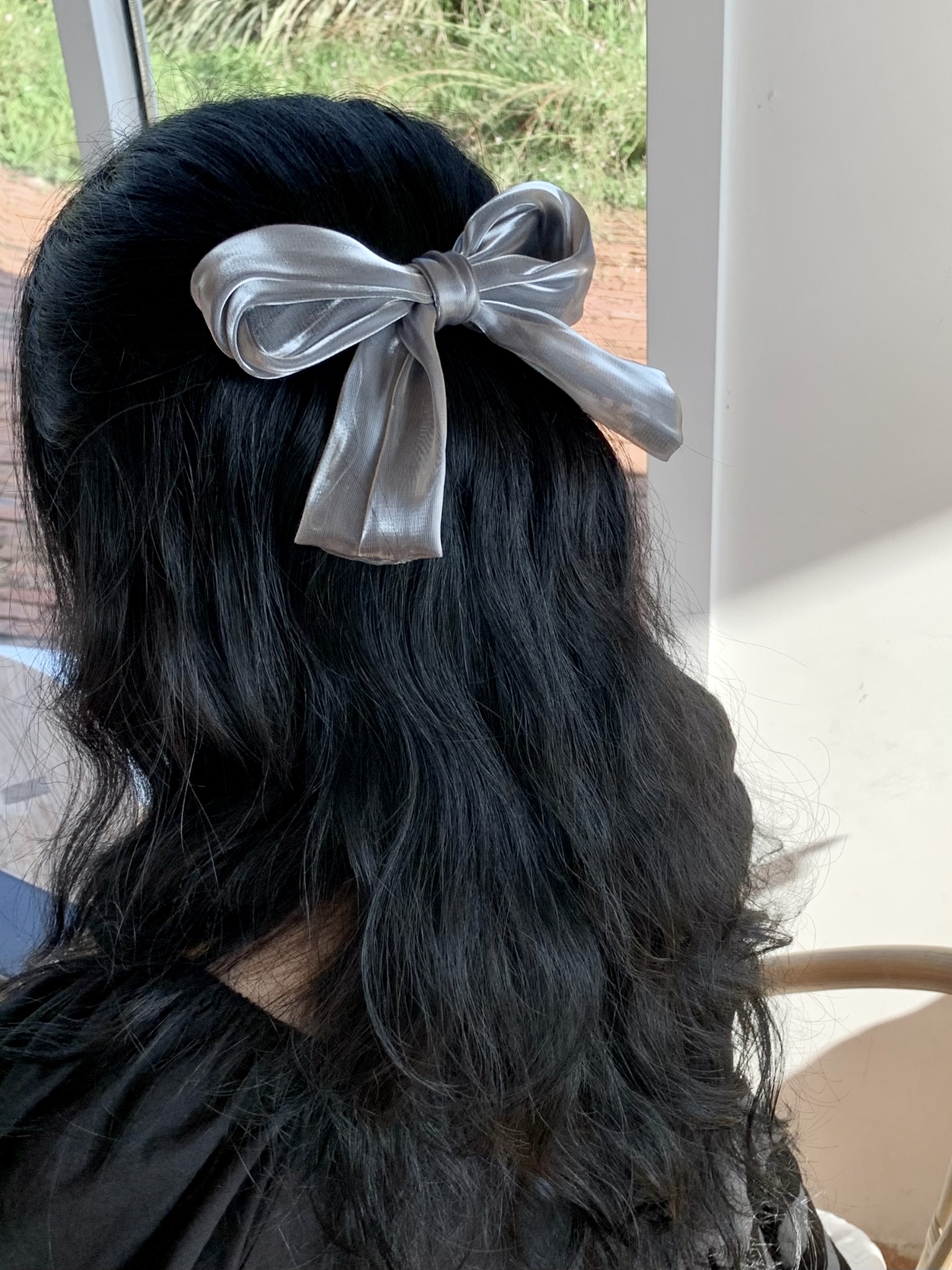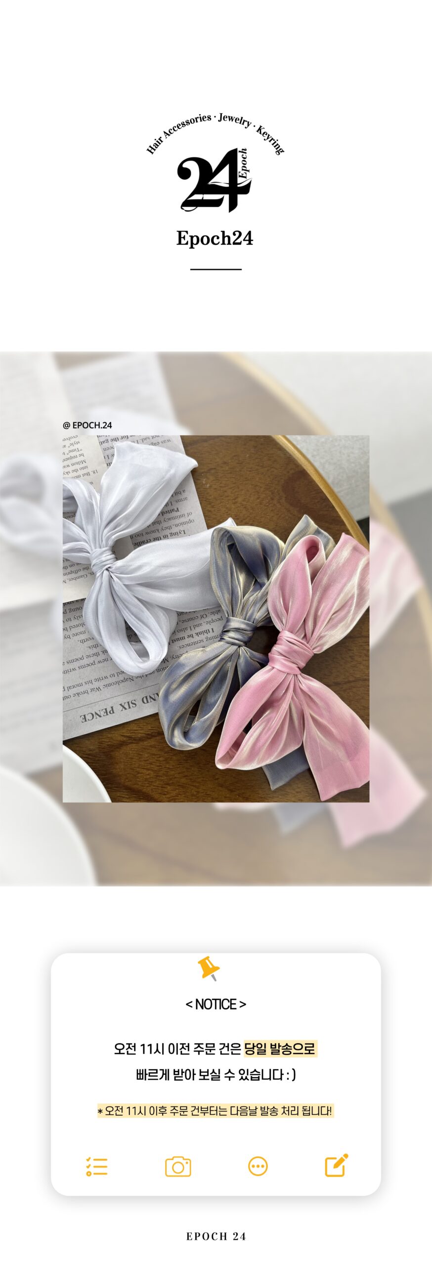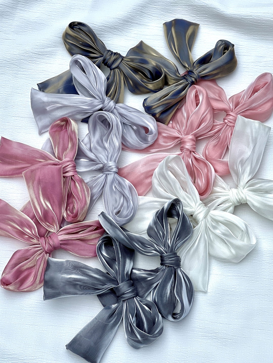 실키한 오간자 소재로 제작된 리본 헤어핀입니다. 너무 크지 않은 사이즈로 부담스럽지 않게 연출하기 좋은 제품입니다. 소재 특성상 리본을 고정하는 와이어 비침이 있을 수 있습니다. 오간자 쉬폰 원단이 가지고 있는 광택감으로 빛에 따라 원단의 컬러가 다르게 보이며 오로라 빛의 색감을 느끼실 수 있습니다 .