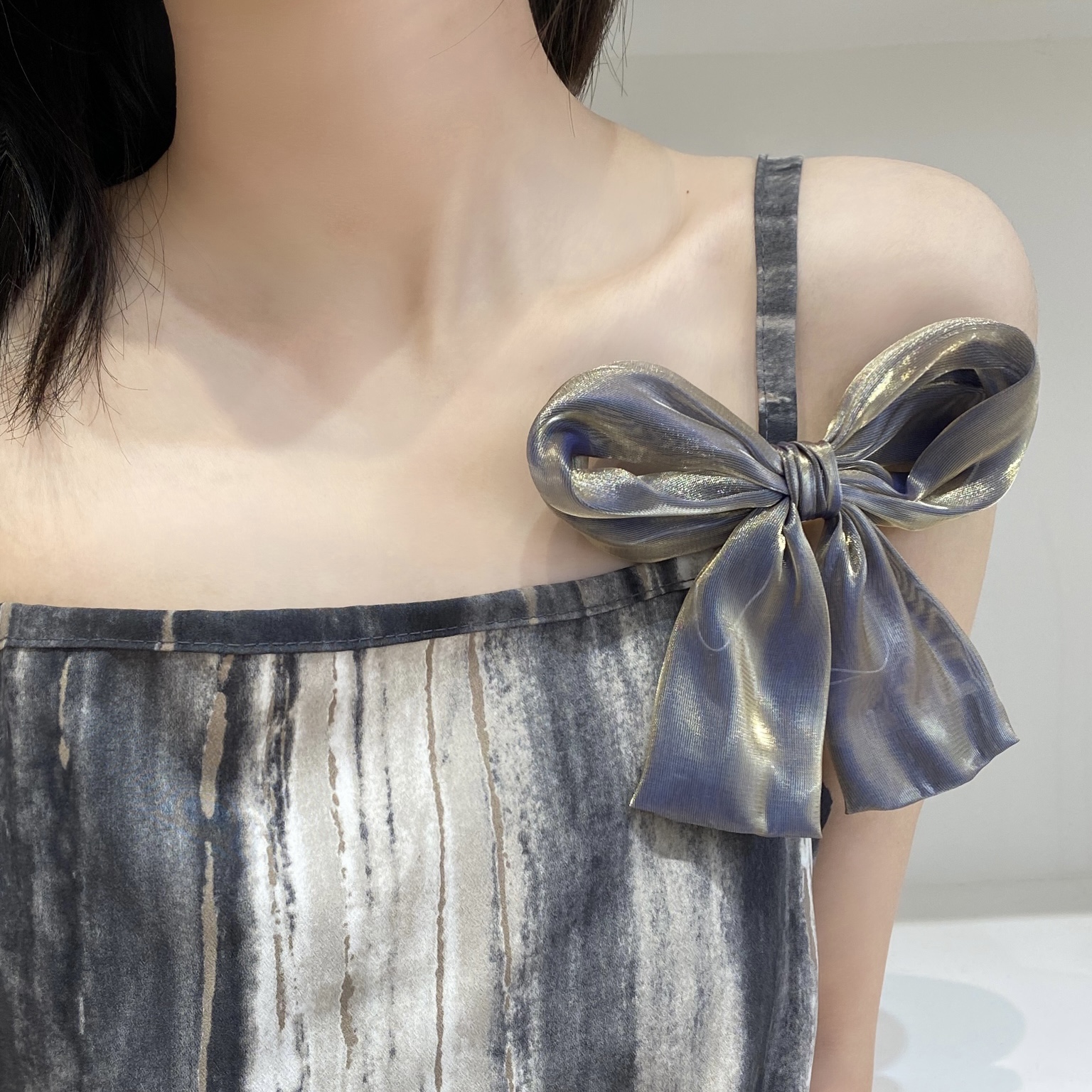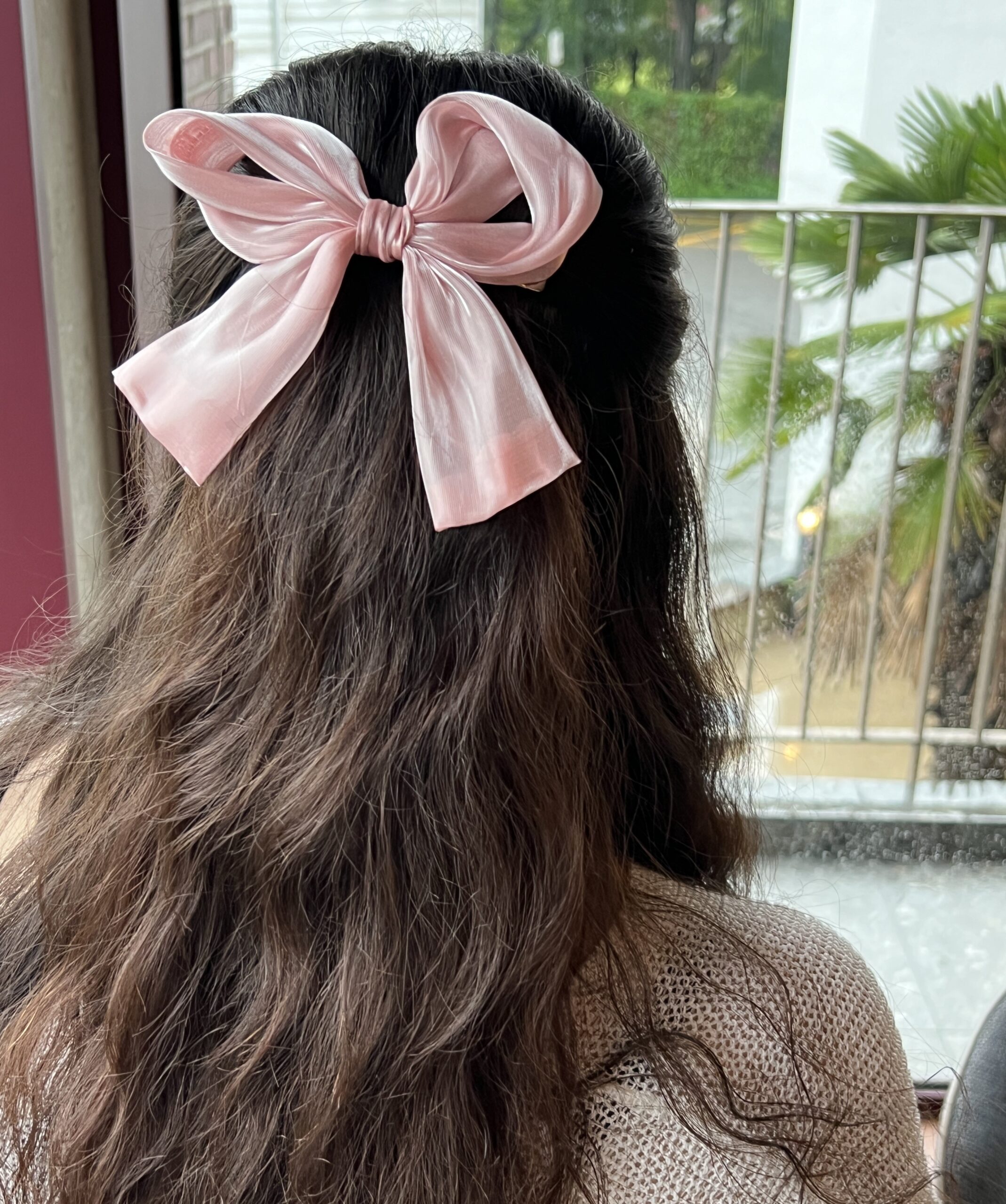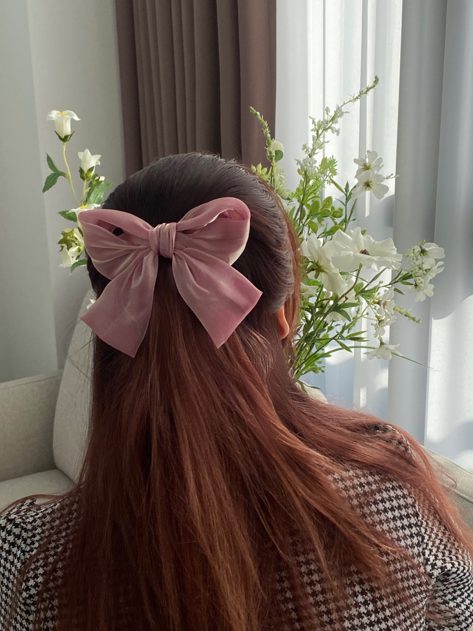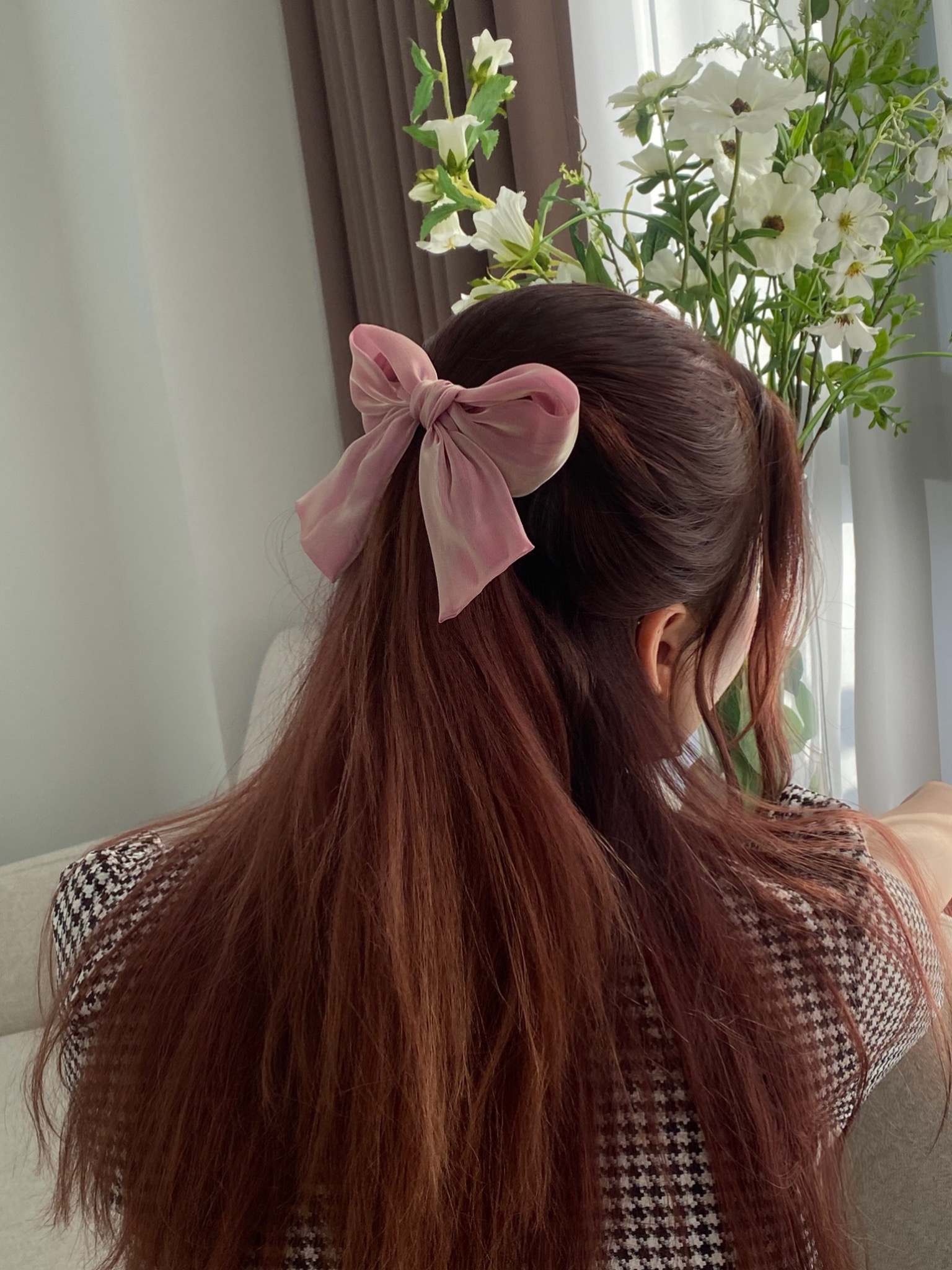 실키한 오간자 소재로 제작된 리본 헤어핀입니다. 너무 크지 않은 사이즈로 부담스럽지 않게 연출하기 좋은 제품입니다. 소재 특성상 리본을 고정하는 와이어 비침이 있을 수 있습니다. 오간자 쉬폰 원단이 가지고 있는 광택감으로 빛에 따라 원단의 컬러가 다르게 보이며 오로라 빛의 색감을 느끼실 수 있습니다 .