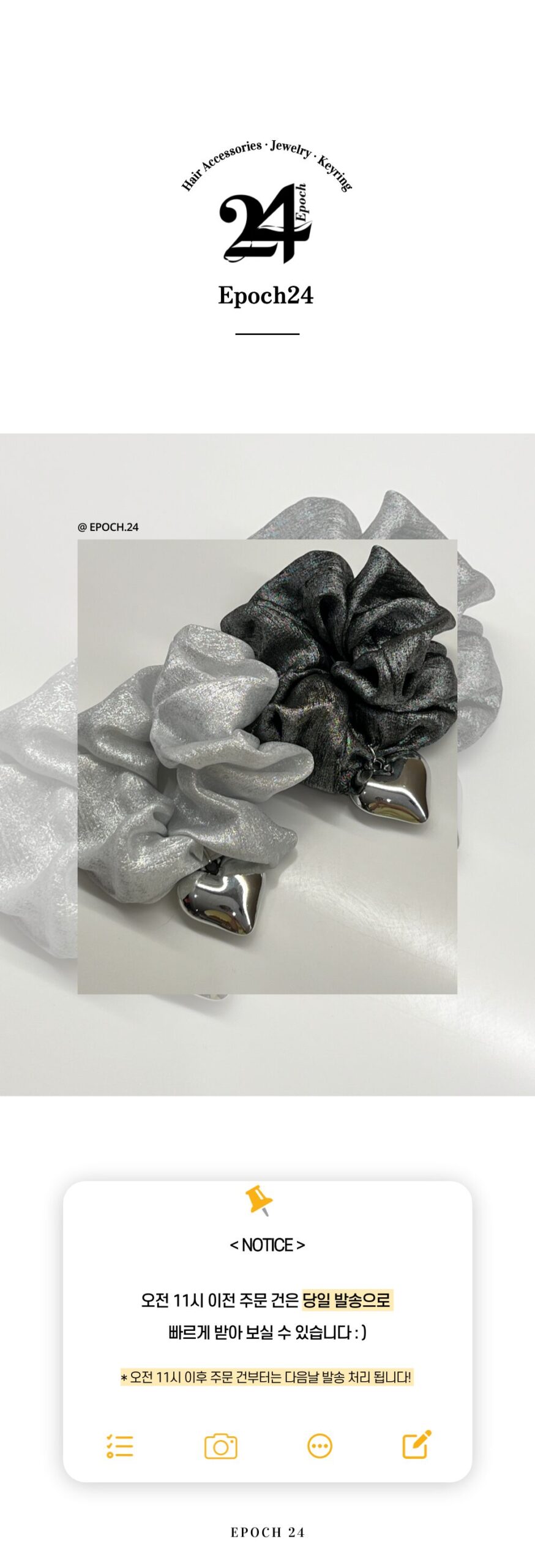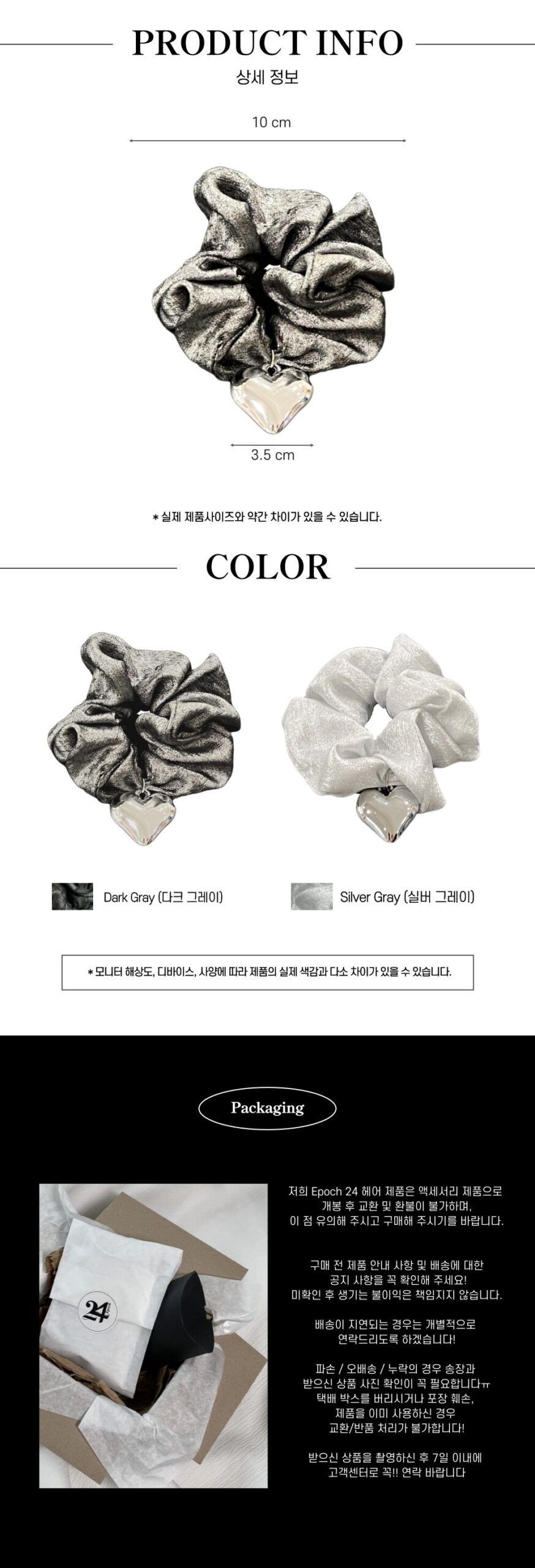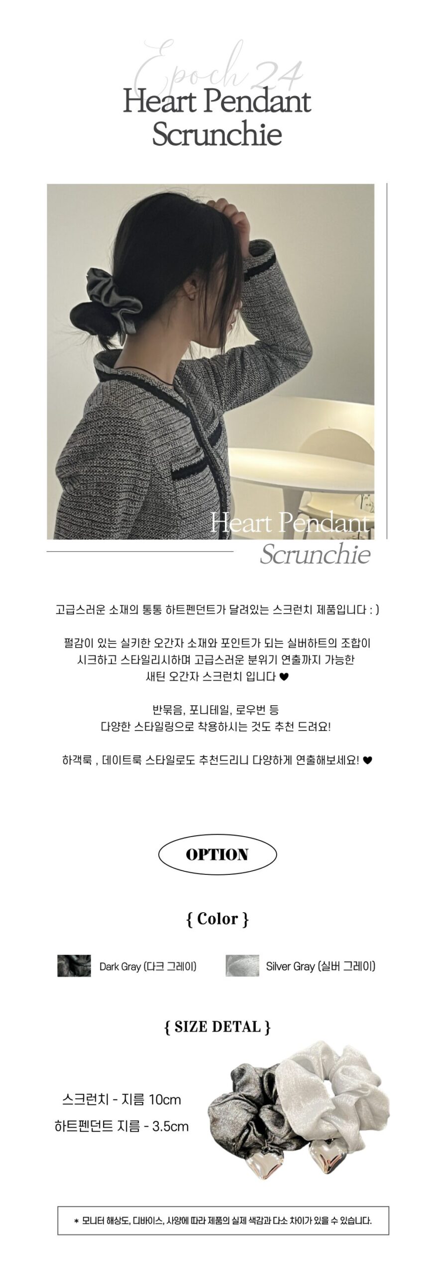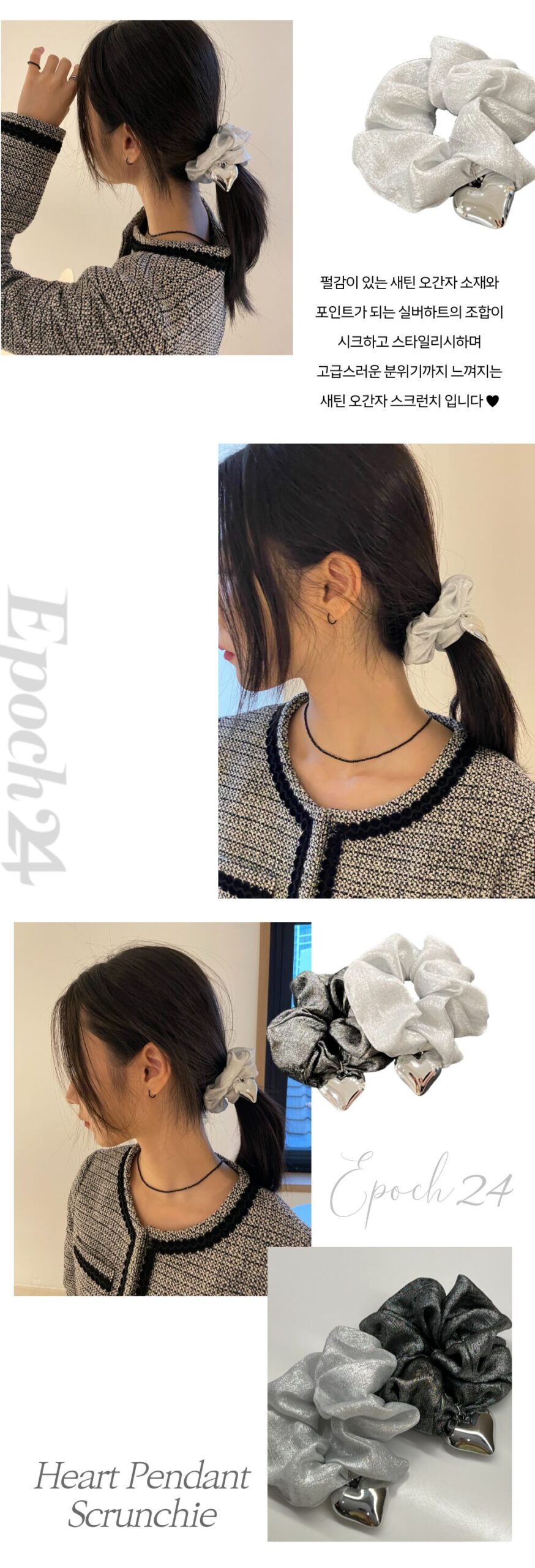 펄감이 있는 실키한 오간자 소쟁와 포인트가 되는 실버하트 팬던트가 달려있는 스크런치 제품입니다. 시크하면서도 고급스러운 분위기로 연출가능하며 반묶음이나 로우번 등 다양한 스타일링으로 착용하실 수 있습니다 . 하객룩, 데이트룩으로 추천드리니 다양하게 연출하여 착용해보세요!